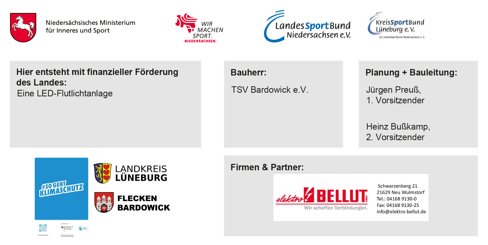 TSVBardowick LED Projekt BauschildDer TSV Bardowick muss dringend seine Flutlichtanlage sanieren. Der Vorstand hat hierfür im Februar 2021 ein Projekt aufgesetzt. Nach dem Besuch von Informationsveranstaltungen und einer Bedarfsanalyse wurde ein entsprechendes Konzept sowie Finanzierungsmöglichkeiten erarbeitet. Seit dem 22.08.2022 ist das Finanzierungskonzept final und ab dem 01.10.2022 kann mit der Umsetzung begonnen werden.TSVBardowick NKI