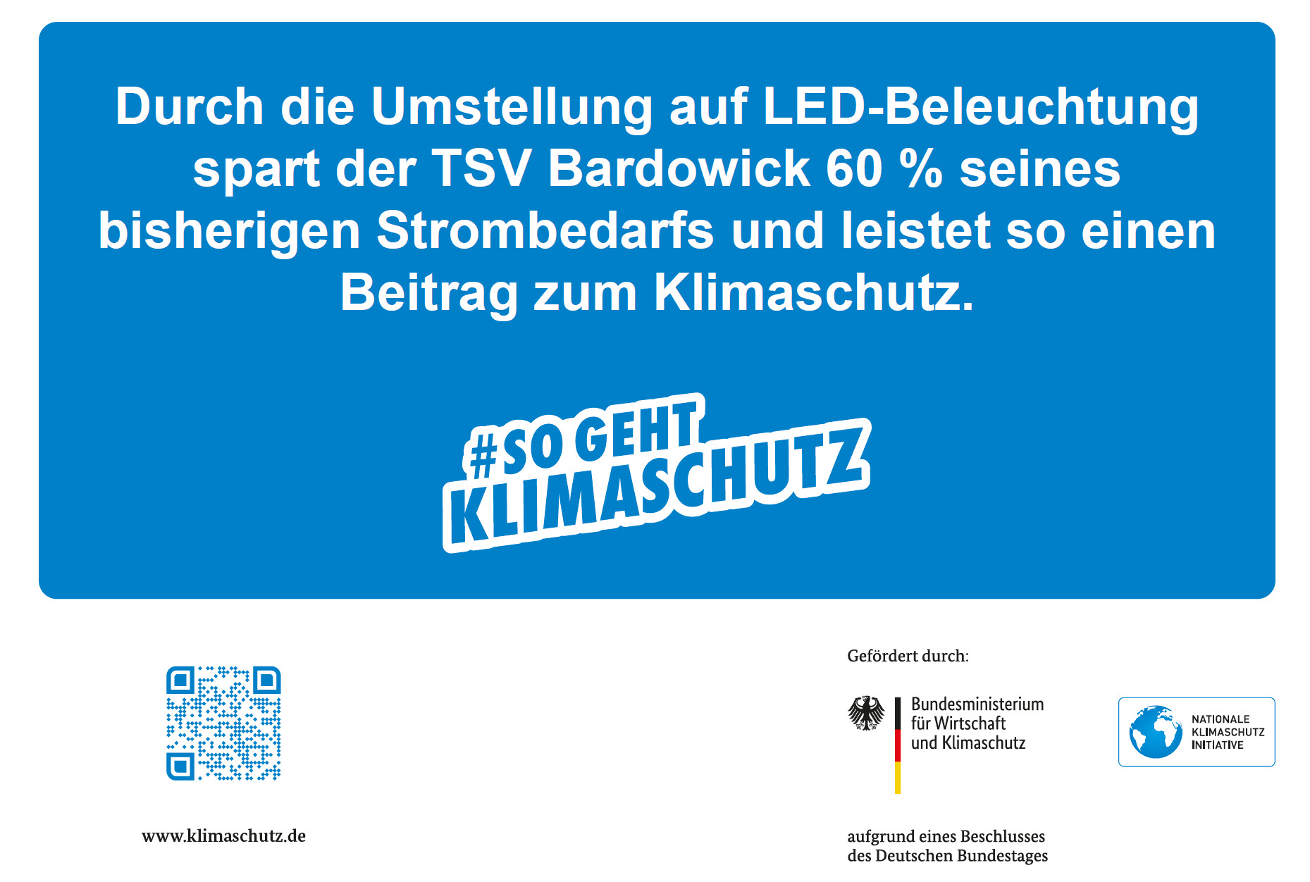 Finanziell werden wir vom Bund, vom Landessportbund Niedersachsen, vom Landkreis und vom Flecken Bardowick unterstützt. Der Bund wird in diesem Fall von der "Zukunft - Umwelt - Gesellschaft (ZUG) gGmbH, Geschäftsbereich Nationale Klimaschutzinitiative (NKI) Fördermittelmanagement Kommunalrichtlinie 1" repräsentiert. Detaillierte Informationen gibt es über folgenden Link: https://www.klimaschutz.de/kommunalrichtlinie . Das Förderkennzeichen ist 67K20401. Es ist erstmalig, dass der TSV Bardowick von hier finanzielle Unterstützung erhält. Wir freuen uns aber, dass wir damit einen guten Teil zur Nationalen Klimaschutzinitiative beitragen.