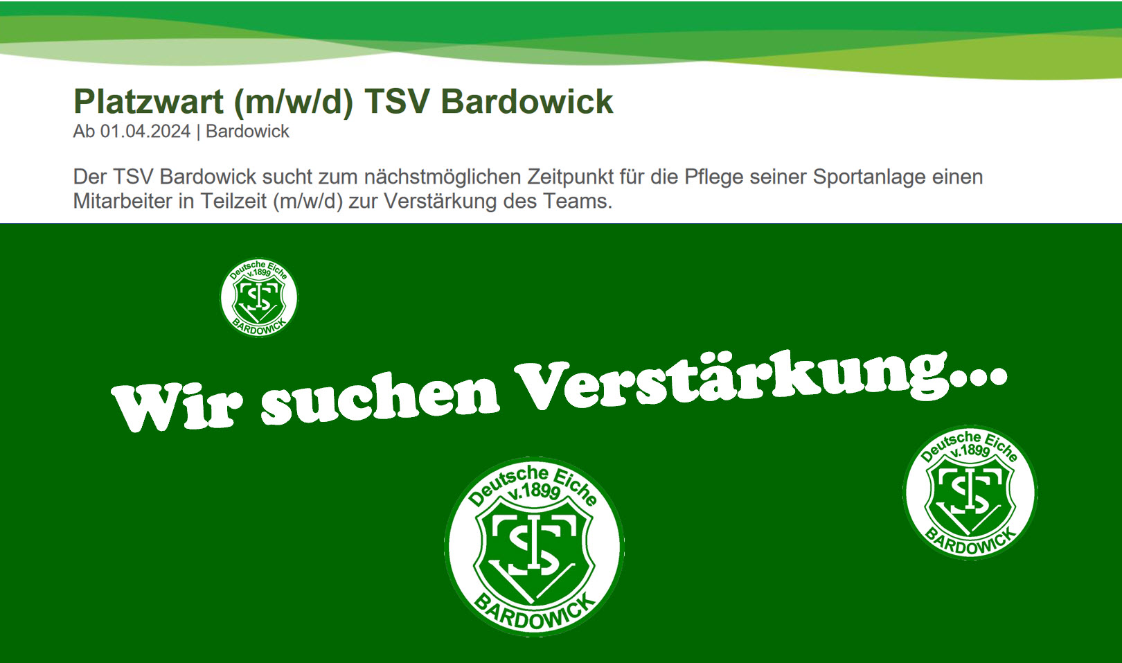 Der TSV Bardowick sucht für die Platzwart-Aufgaben einen neuen Mitarbeiter (m/w/d). Nähere Informationen können der nachfolgenden Stellenanzeige entnommen werden (hier klicken).